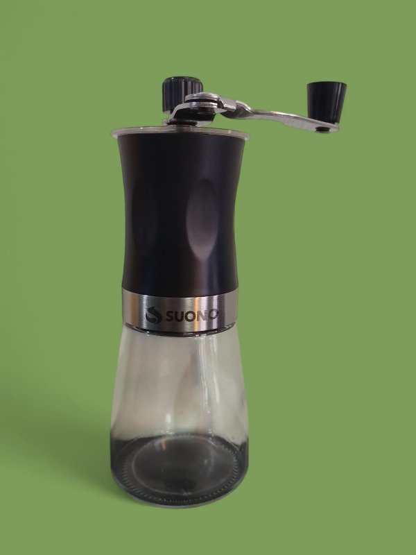 Con muelas de cerámica, regulador de molienda, muele de a 10gr de granos de café, posee recipiente de vidrio para 150gr de café molido y manivela metálica.