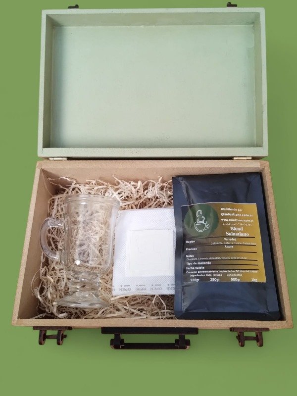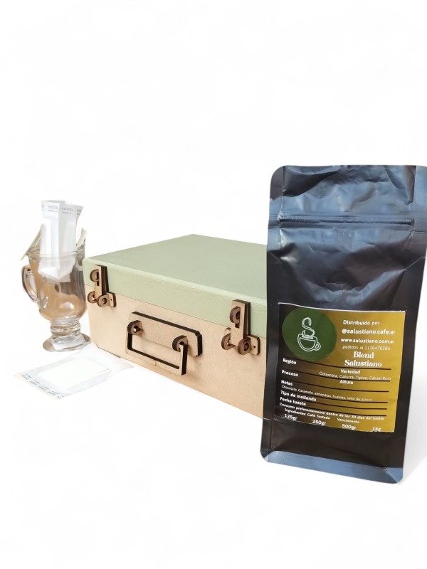 Contiene un portafolio de madera, una jarrito de 120ml de vidrio templado, 2 filtros personales descartables y 125gr de café de especialidad Blend Salustiano, varietal Colombia, Caturra, Típica y Catuaí Rojo.