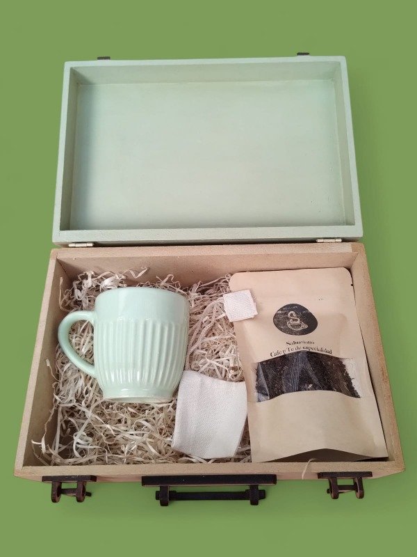 Contiene un maletín de madera, taza decorativa, saquito reutilizable y 25gr de Té Blend Red Velvet