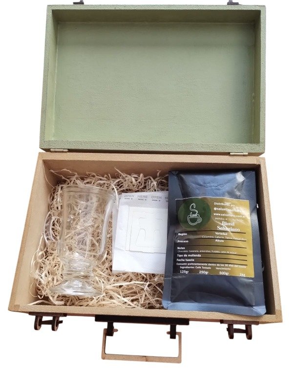 Contiene un portafolio de madera, una jarrito de 120ml de vidrio templado, 2 filtros personales descartables y 125gr de café de especialidad Blend Salustiano, varietal Colombia, Caturra, Típica y Catuaí Rojo.